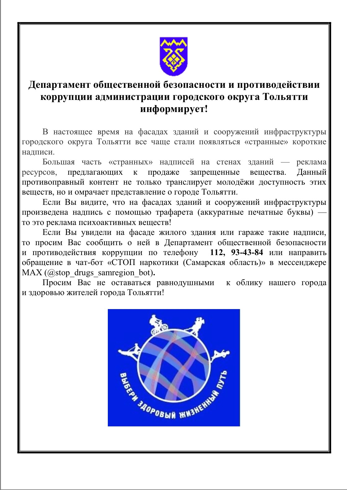Если Вы видите, что на фасадах зданий и сооружений инфраструктуры произведена надпись с помощью трафарета (аккуратные печатные буквы) — то это реклама психоактивных веществ! Если Вы увидели на фасаде жилого здания или гараже такие надписи, то просим Вас сообщить о ней в Департамент общественной безопасности и противодействия коррупции по телефону 112, 93-43-84 или направить обращение в чат-бот «СТОП наркотики (Самарская область)» в мессенджере МАХ (@stop_drugs_samregion_bot). Просим Вас не оставаться равнодушными к облику нашего города и здоровью жителей города Тольятти! |